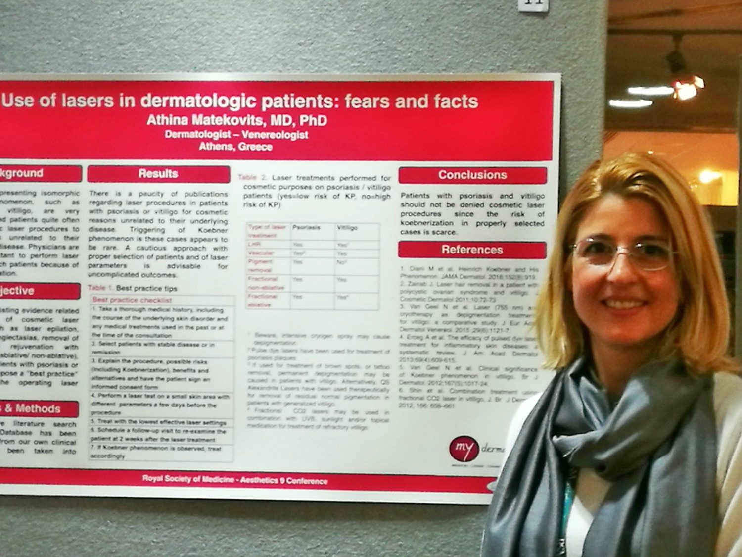 Η ιατρός παρουσίασε το θέμα “Lasers in dermatologic patients: fears and facts.” η οποία αναφέρεται στην ασφάλεια των θεραπειών laser που διενεργούνται για αισθητικούς σκοπούς (πχ αποτρίχωση, αντιγήρανση, κλπ) σε ασθενείς με χρόνιες δερματοπάθειες όπως ψωρίαση και λεύκη – παθήσεις που χαρακτηρίζονται από την εμφάνιση ισομορφικού φαινομένου (Koebner). Η εργασία έγινε δεκτή με ιδιαίτερο ενδιαφέρον και θετικά σχόλια.